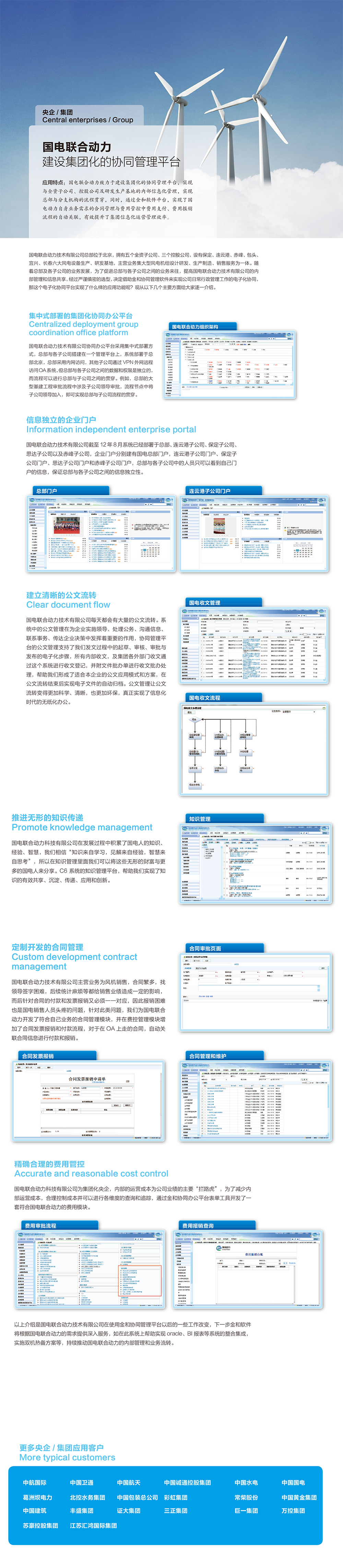 國電聯(lián)合動力技術(shù)有限公司總部位于北京,擁有五個全資子公司、三個控股公司,設(shè)有保定、連云港、赤峰、包頭、宜興、長春六大風電設(shè)備生產(chǎn)、研發(fā)基地,主營業(yè)務(wù)集大型風電機組設(shè)計研發(fā)、生產(chǎn)制造、銷售服務(wù)為一體。隨著總部及各子公司的業(yè)務(wù)發(fā)展,為了促進總部與各子公司之間的業(yè)務(wù)來往,提高國電聯(lián)合動力技術(shù)有限公司的內(nèi)部管理和信息共享,經(jīng)過嚴謹縝密的選型,決定借助金和協(xié)同管理軟件來實現(xiàn)公司日常行政管理工作的電子化協(xié)同,那這個電子化協(xié)同平臺實現(xiàn)了什么樣的應(yīng)用功能呢?現(xiàn)從以下幾個主要方面給大家逐一介紹。
